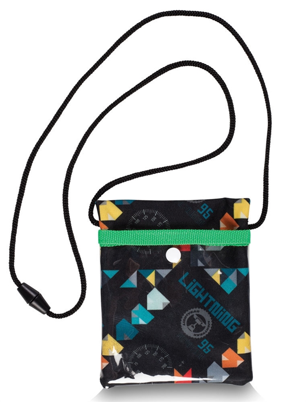 Den har to lynlås lommer og en plastik lomme bagpå.